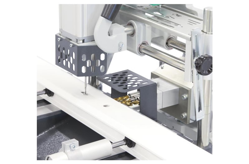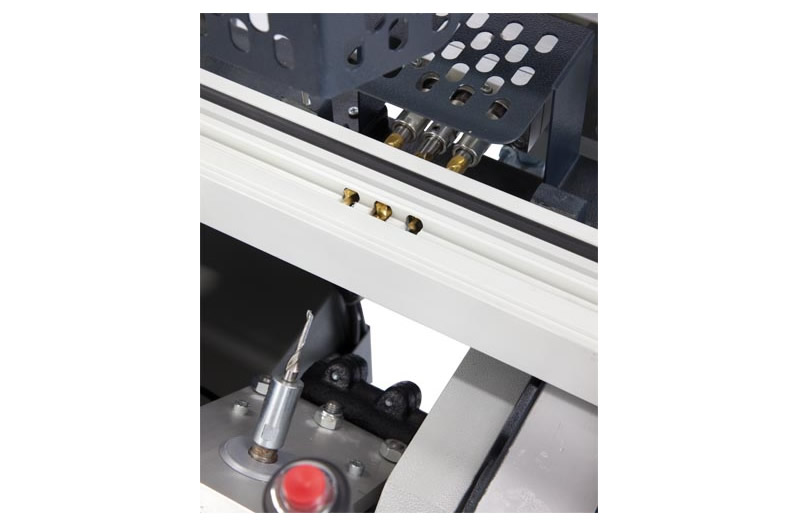 Triple spindle drilling with manual feed for espagnolette holes on PVC sash profiles.